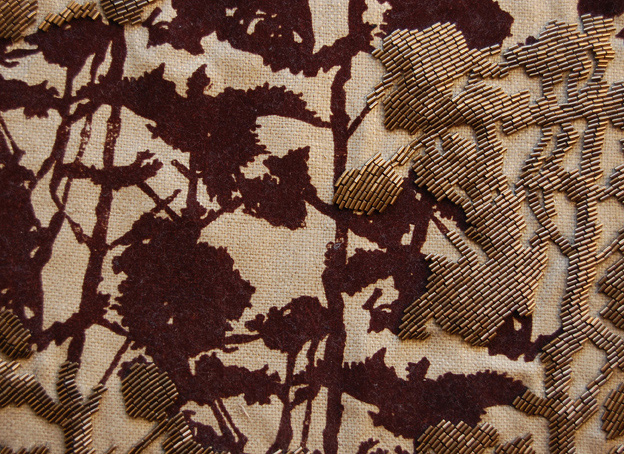 This collection for women’s wear Spring/Summer 2011 is based upon military styling, creating designs that combine sheer feminine fabrics with heavier linens/wools, beading and embroidery techniques. The collection has been inspired by the 2010 Hand and Lock brief Light Rich, which has influenced the use of disintegration techniques within the designs and from this the visual comparison to camouflage. The imagery is inspired by military costume embroideries and floral/camouflage based visuals influenced by drawings and photos. Flock has been utilised in creating worn patterns along with various stitch techniques, including tapestry which when used with the embellisher machine creates a disintegrated look. A scattered, broken line of beads and sequins is used within some pieces to emphasise the worn style. A mixture of hand and machine couching inspired by military gold work and filling beads/ sequins, create heavier sections within delicate surfaces. Layering of sheer fabrics, such as organza and netting combined together create the effect of camouflage and hints at sections that have been aged by time. The colours mix light translucent flesh, violet and tangerine tones with richer iridescent raspberry pink, chocolate and chestnut hues which combined with khaki shades creates a diverse and sophisticated palette suitable for S/S. Sequins, beads and thread choice highlight metallic elements that add a richness to create exquisite surfaces.